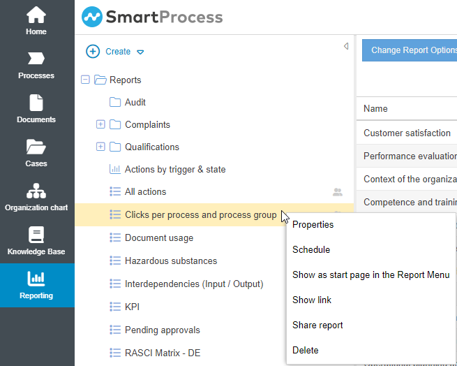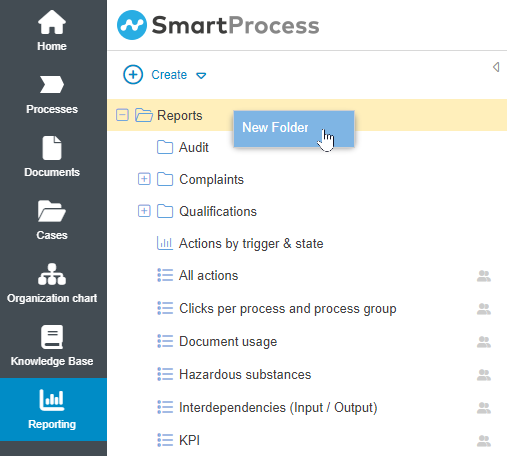 For example, saved reports that refer to data from processes are displayed in the Processes menu in the Lists and Reports section of the Process Explorer. They can also be executed directly from there without having to switch to the Reporting menu first. A saved report that refers to data of the workflow Action is also displayed in the navigation area of the menu item Action.