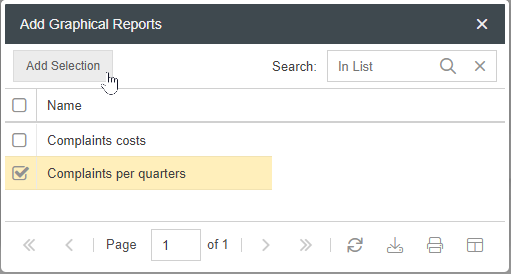 By clicking on the <+ Add> button, you will be shown additional saved graphical reports that you can display for yourself in the Graphical Reports window. Select the desired reports for display and confirm via <Apply selection>.