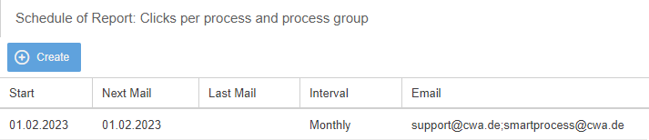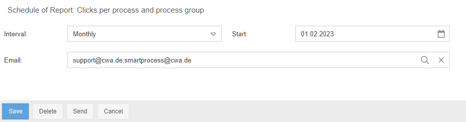 The start date sets the first day of sending the email. From this day on, the report will be sent regularly at the selected interval. One or more SmartProcess users can be selected as recipients via the magnifying glass in the Email field, and their e-mail addresses will be taken over. In addition, further recipient addresses can also be entered manually in the Email field, separated by semicolons.