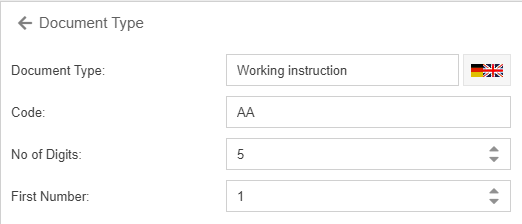 In the example, the first document with the document type Working instruction is assigned the document number "AA-00001". The next document of the type Working instruction receives the number "AA-00002", and so on.