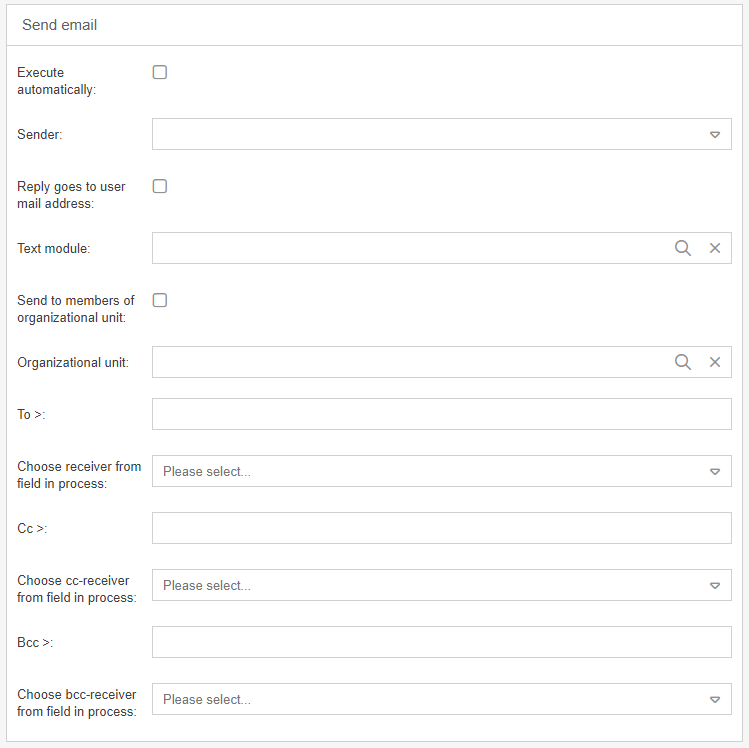 Choose Bcc-receiver from field in process | In this selection field all fields of the main form are listed. A field selected here must contain an e-mail address in the process in order for the e-mail to be sent. It is not enough to select a field that only contains the name of one user. |
