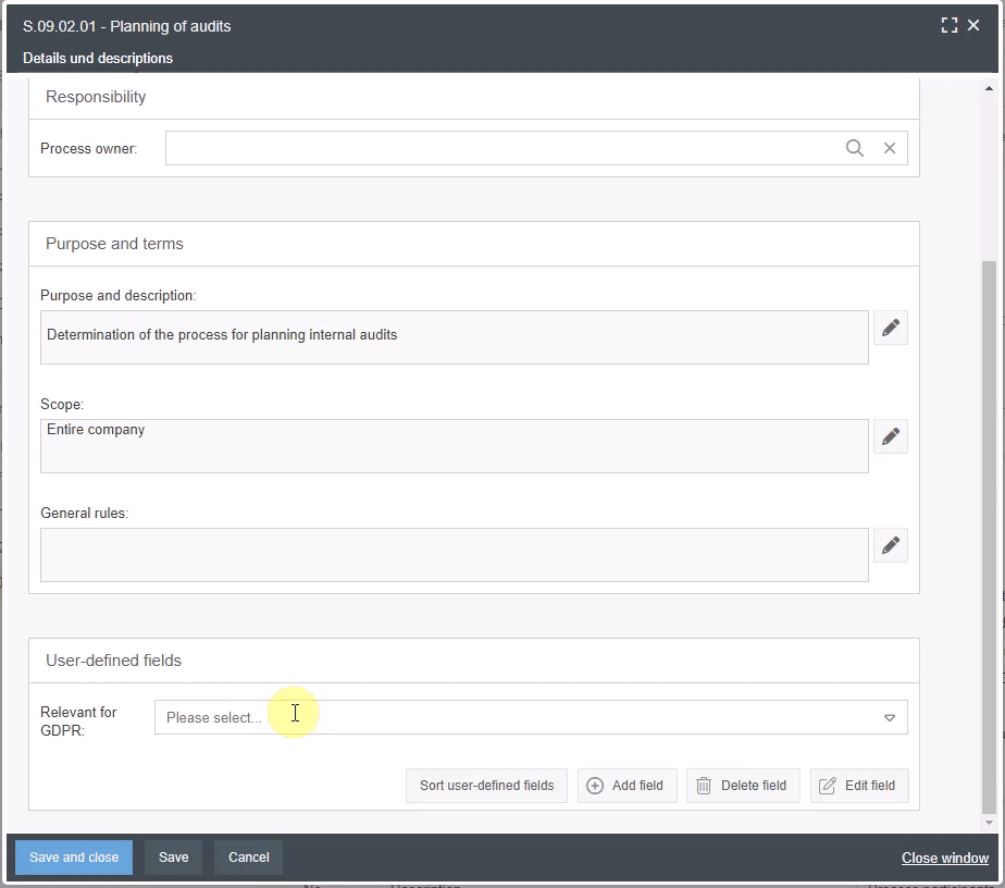 - In the system text module for publishing a new process, placeholders can now be inserted for the fields "Scope" and "Purpose and description".