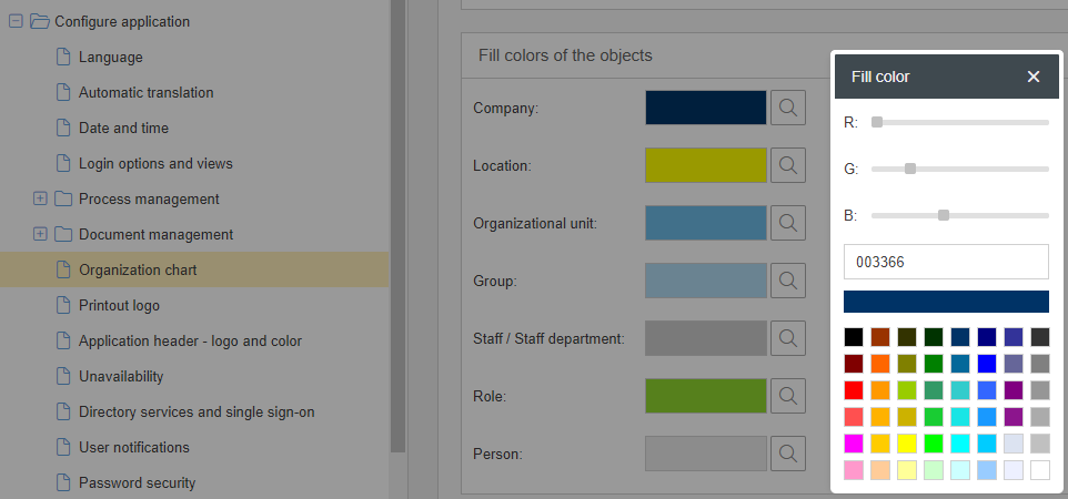 - In the settings for organization chart objects and the application header, the fill color can now be selected from a predefined palette (in addition to the previous option of entering a hexadecimal color code)