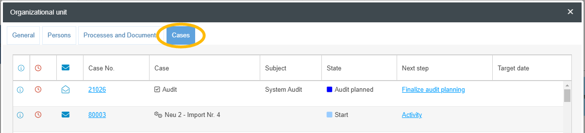 - A Cases tab has been added to the properties of organizational units. This allows viewing the cases currently assigned to the organizational unit directly from the organization chart.