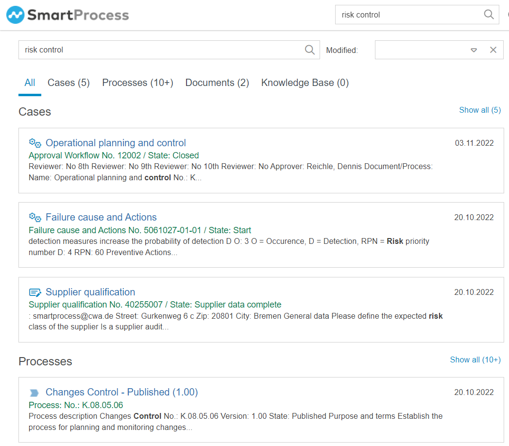 - The display of results in the full text search has been improved. There is now a cross-menu view "All" in which up to 3 results per menu are displayed. Using the tabs in the upper area, only the results for cases, processes, documents or the knowledge base can be displayed. In the tab Cases the possibility to filter the results according to the case type has been added.
