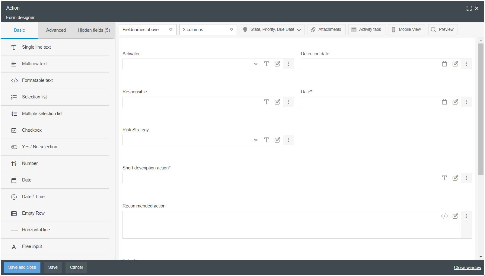 - The design of the Form designer has been revised. In the course of this, new field types were added for better differentiation (selection list, yes / no selection, checkbox) and the view of the field properties was restructured to improve clarity.