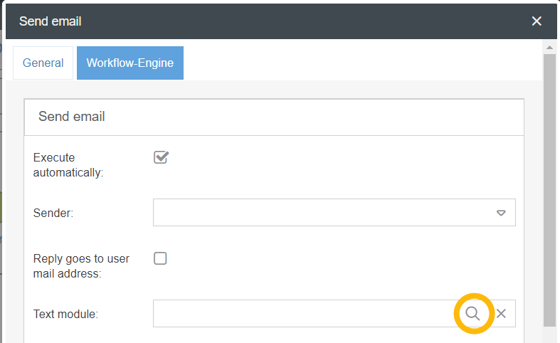 - The selection of text modules to be sent has been changed. A click on the magnifying glass icon opens a list of all existing text modules and offers the possibility to edit them or create a new one if required. This affects the objects Send email, Forward case (Individual e-mail notification) and Send form via email.