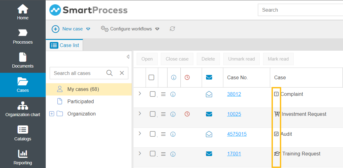 - In case lists (e.g. "My cases"), the workflow icon defined in the workflow settings is now additionally displayed in the "Case" column in front of the workflow name.
